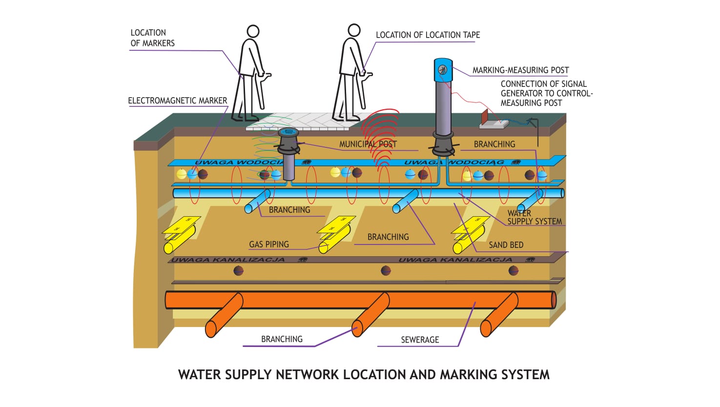The high density of water supply networks, particularly in urban areas, makes proper marking of their layout especially important. The solution here lies in marking the water supply networks with detectable and non-detectable warning tapes. Such tapes provide an early warning regarding the existence of a water line, which prevents accidental damage to the water supply network. It is possible to add a stainless steel insert to the tape, which ensures an easy location of the network.